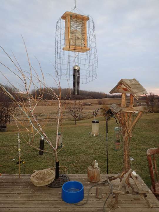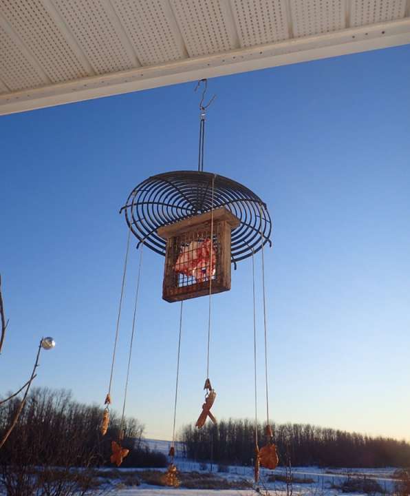 There are a few simple ways to keep the bully birds from accessing seeds and suet. Exclusion enclosures using mesh/lath (e.g., stucco wire) to encircle the feeder will allow small birds to enter and exit while keeping the larger birds out. Even old bird cages will work! Weight-activated feeders work well too, since the body weight of a large bird or squirrel will force a sleeve to close down over the feeding portals. Upside down feeders as well as tube feeders that have small feeding ports will also discourage squirrels and the larger bully birds from accessing seeds.