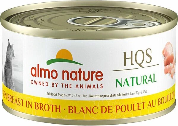 Almo Nature Chicken Breast Canned Cat Food is made with hormone-free chicken that is natural and human-grade. This formula is high in protein and provides many essential vitamins, minerals, and essential fatty acids. There are no by-products or supplements included, so you can rest assured that your cat is getting the healthiest, most natural diet possible. This is a nourishing and delicious meal that's sure to appeal to your companion's inner wild cat. Crafted with HQS (High Quality Sourced) ingredients that were originally fit for human consumption and repurposed for use in pet food only.
