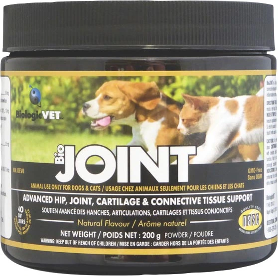 BiologicVET BioJOINT is a cohesive blend of powdered ingredients, designed to help activate the chondrocytes (worker cells of the cartilage), and support their effective use of glucosamine in the rebuilding of collagen. Supplying 200 mg of MSM, 200 mg of glucosamine complex (sulfate, hydrochloride) and 80 mg of chondroitin per 5 g scoop (used for each 20 lb of animal's body weight), GMO-Free BioJOINT contains a blend of powerful antioxidants, vitamins and herbs that facilitate a healthy inflammatory response and support healthy joint function.
