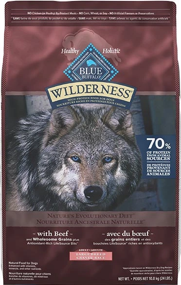 Satisfy the spirit of the wolf with meat-rich BLUE Wilderness. This high-protein dog food recipe contains more of the delicious beef your large breed dog loves, with wholesome grains like oats, barley, and brown rice, plus glucosamine and chondroitin to support their joint health and mobility.