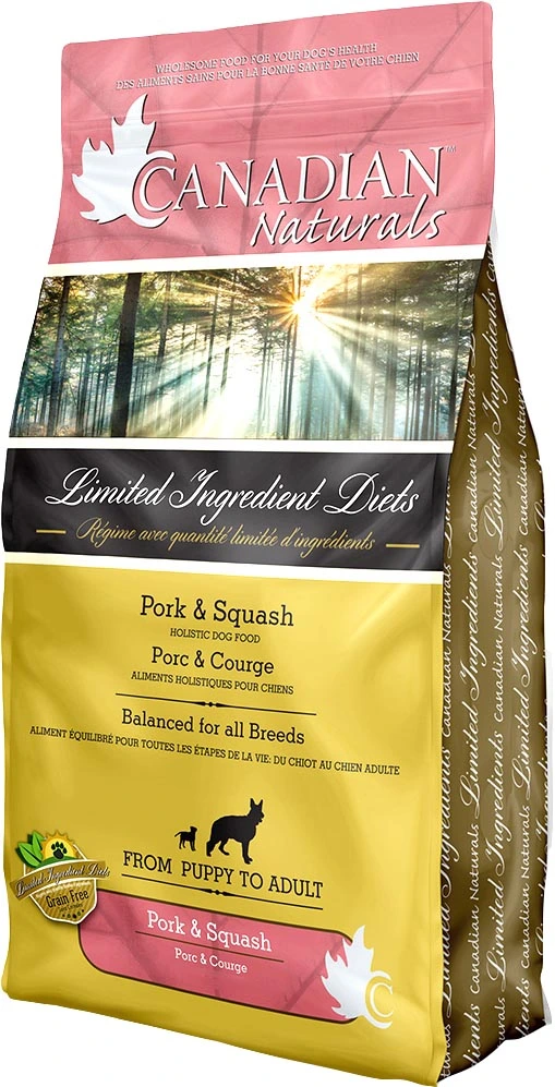 Canadian Naturals LID Pork & Squash Recipe is an excellent food for dogs with food allergies and sensitive digestive tracts. The simple ingredient list includes pork as the single animal protein source. In addition, squash alongside sweet potatoes and flaxseed provides excellent flavour and is easy for dogs to digest. It is a low-glycemic carbohydrate that has been substituted for grains in this formula. The mix of vitamins, minerals, and Omega 3 and six fatty acids ensures that your dog is receiving a quality, balanced diet. Made in Canada. Appropriate for dogs of all breeds and life stages.