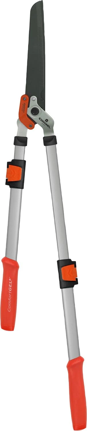 The DualLINK™ Hedge Shear has extendable 7 inch to 14 inch steel handles that provide powerful lever assisted cutting action. This tool has an innovative locking mechanism on extendable steel handles for more control. ComfortGEL® grips for superior comfort. ShockGUARD® bumper reduces fatigue. Two-zone blade for trimming or large cuts. 9¾ inch blades.