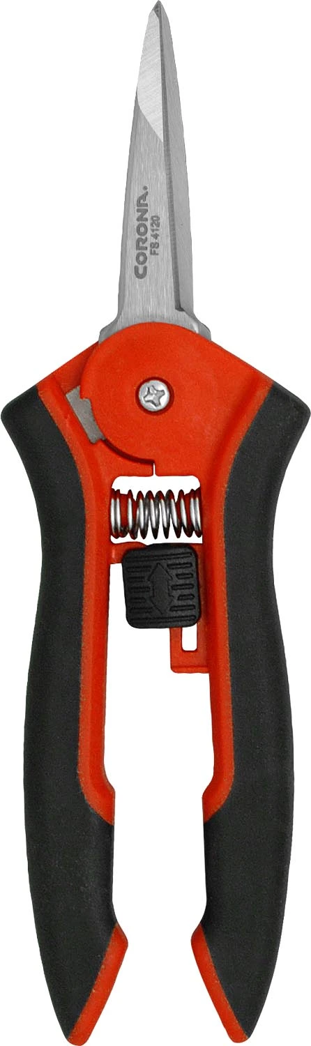 Designed with precision control in mind, the Corona Hydroponic Micro Snip makes the perfect trimming scissors for cannabis, hydroponic plants, microgreens, herbs and more. These gardening snips feature a 2 5/16-inch resharpenable blade with double-beveled, tapered tips for fine pruning. Made with corrosion-resistant stainless steel, the blade is easy to clean and resist germ and residue build-up. The durable, soft-touch handles provide lightweight comfort, while the heavy-duty spring helps reduce hand fatigue and promises long-term performance. Both the blade and handles can be sanitized, helping reduce cross-contamination between plants and seedlings. These gardening scissors are an essential tool for both professional and hobby gardeners who need to make high-volume, clean cuts season after season.