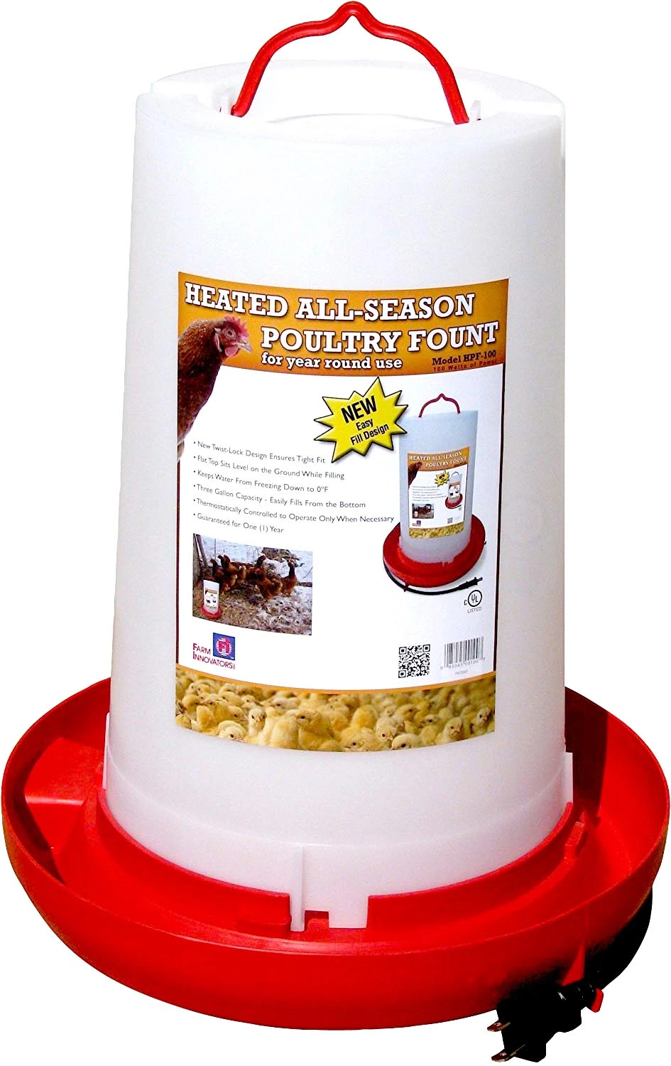 This unique product is designed like a traditional plastic poultry fountain but has the added benefit of being able to use it during the winter. The base has a 100 watt thermostatically controlled heater built into it.