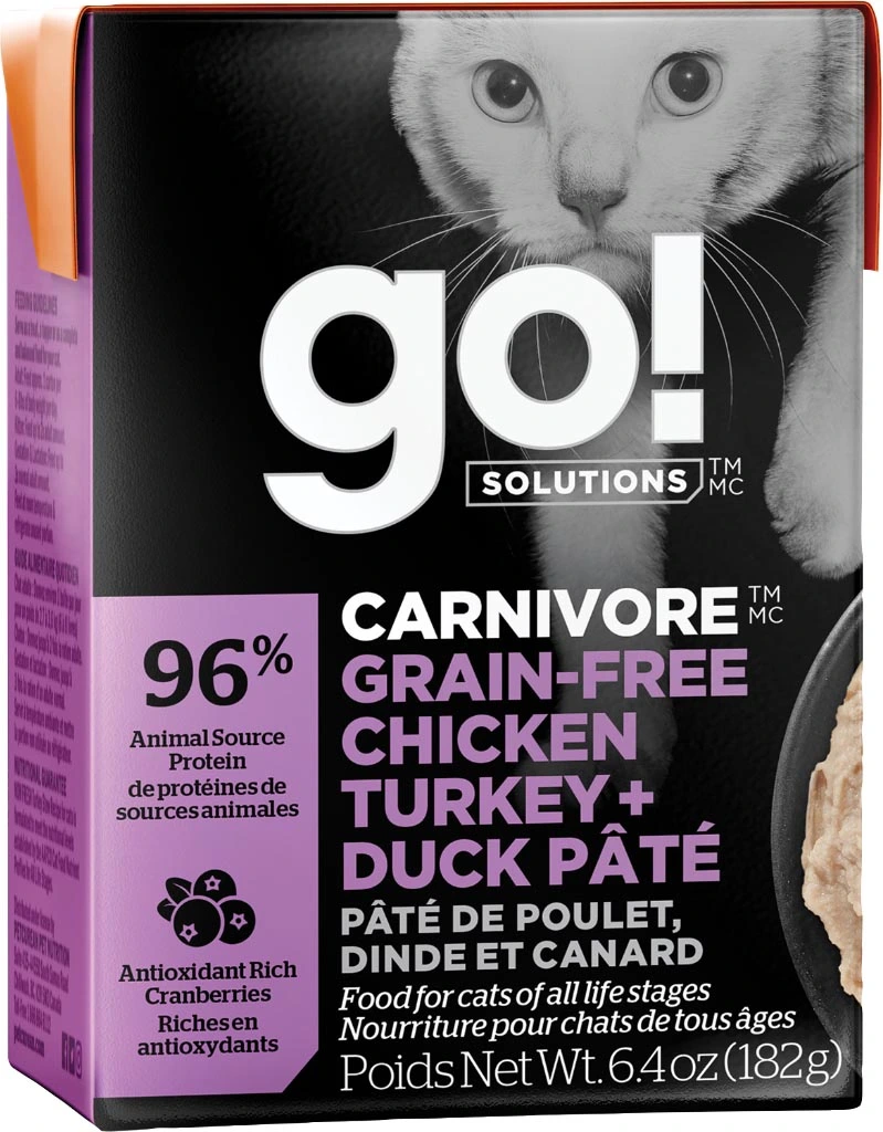 We all know that some cats have decidedly carnivorous preferences. That’s why each of our grain and gluten-free GO! SOLUTIONS CARNIVORE recipes has been crafted using maximum meat protein to provide complete & balanced nutrition for meat-loving cats, and ensure they lead healthy, fit and playful lives. Specially prepared using premium quality cage-free chicken, turkey and duck, this whisker-licking GO! SOLUTIONS CARNIVORE recipe is a firm favourite with meat-loving kitties, with added cranberries to support their immune system function and urinary tract health.