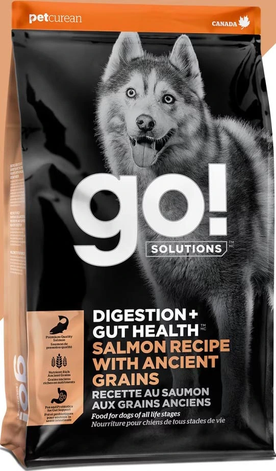 GO! SOLUTIONS DIGESTION + GUT HEALTH Salmon Recipe With Ancient Grains offers a specialized mixture of patented probiotics designed to survive the digestive tract and support digestion, a three-yeast blend to support a healthy gut microbiome, and fibre-rich ancient grains including quinoa, sorghum, millet and oats.