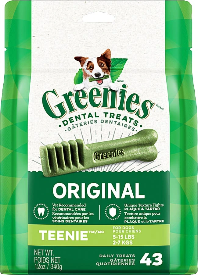 One Greenies™ Original Dental Treat a day is all it takes for clean teeth, fresh breath and a happy dog. Your dog can't wait to sink their teeth into these delicious, original-flavor dental dog chews because they feature a delightfully chewy texture that fights plaque and tartar. Irresistibly tasty and incredibly powerful, Greenies™ Treats for Dogs are recommended by veterinarians for at-home oral care. Best of all, these natural dog treats are made with highly soluble ingredients that are easy to digest. Give your dog the mouth-wowing treat that helps promote oral health with Greenies™ Dog Treats.