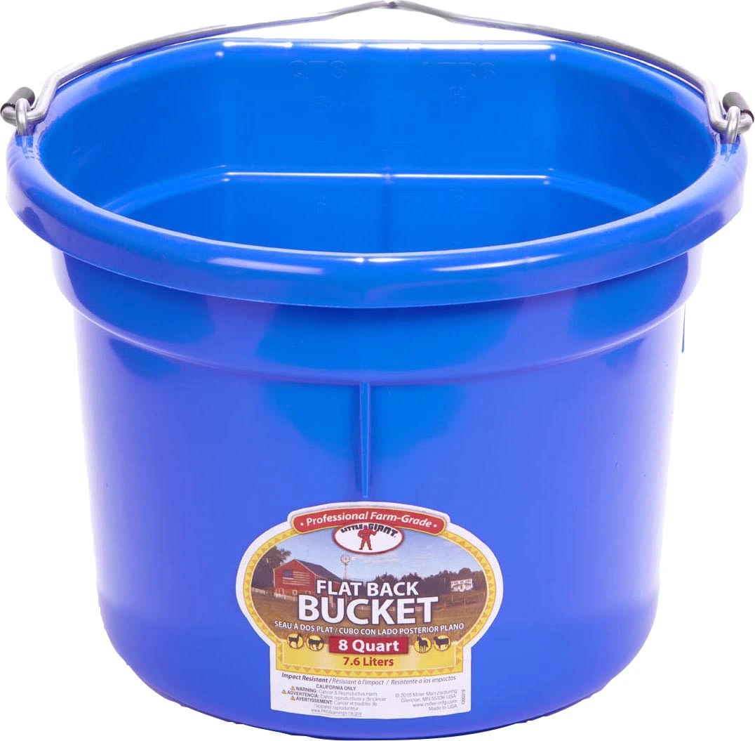 Plastic buckets have always been a favorite around the farm. The Flat Back fits more compactly against a wall or fence and makes hauling heavy loads of water or feed a lot easier. Buckets are made from polyethylene resin that is impact resistant.