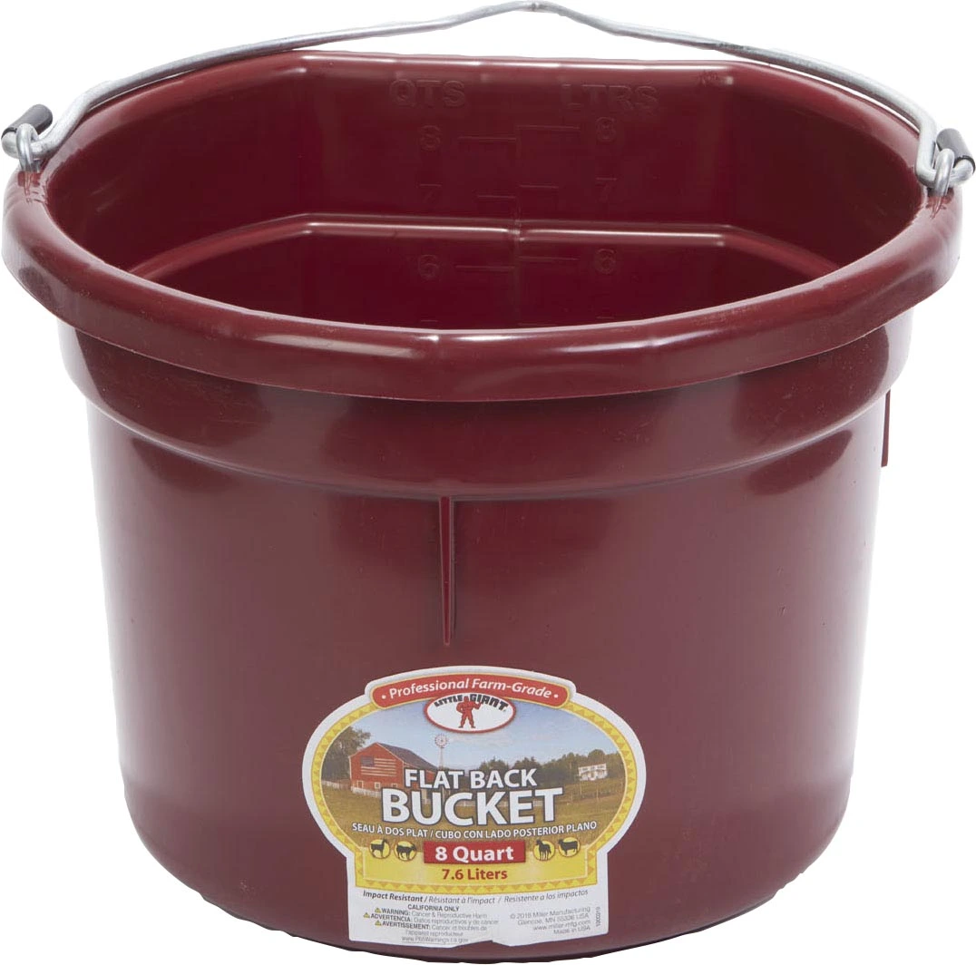 Plastic buckets have always been a favorite around the farm. The Flat Back fits more compactly against a wall or fence and makes hauling heavy loads of water or feed a lot easier. Buckets are made from polyethylene resin that is impact resistant.