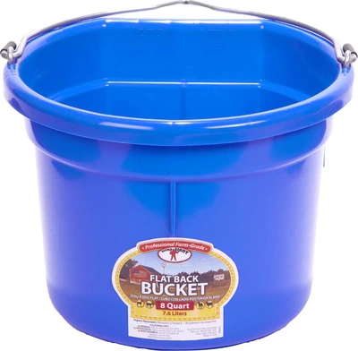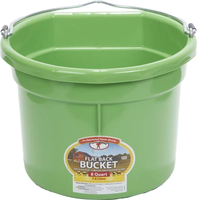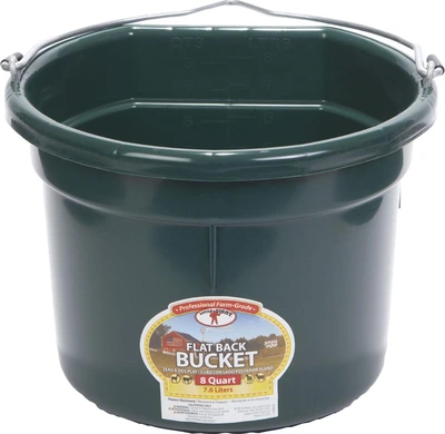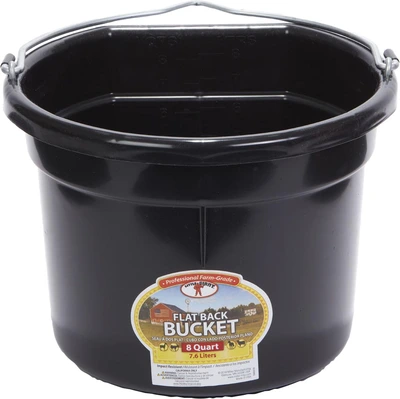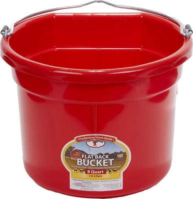 Plastic buckets have always been a favorite around the farm. The Flat Back fits more compactly against a wall or fence and makes hauling heavy loads of water or feed a lot easier. Buckets are made from polyethylene resin that is impact resistant.
