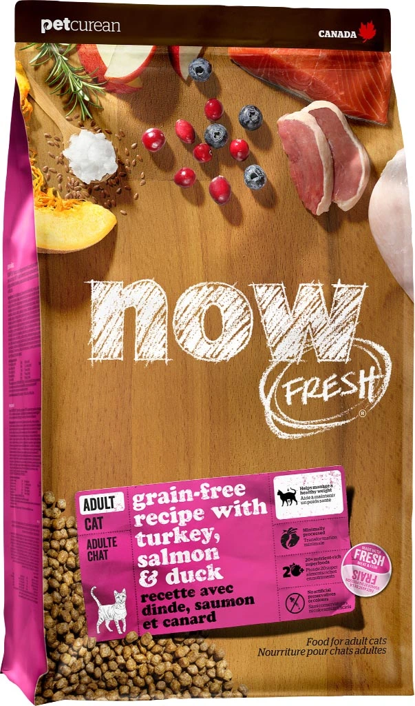 NOW FRESH Grain-Free Adult Recipe is made with 100% fresh turkey, salmon, duck and 100% fresh Omega 3 & 6 oils from coconuts and canola. Made with fresh turkey, salmon and duck, this minimally processed recipe provides balanced protein and fat to help your adult cat maintain a healthy weight, with over 20 superfoods for essential nutrients and to help support healthy digestion.