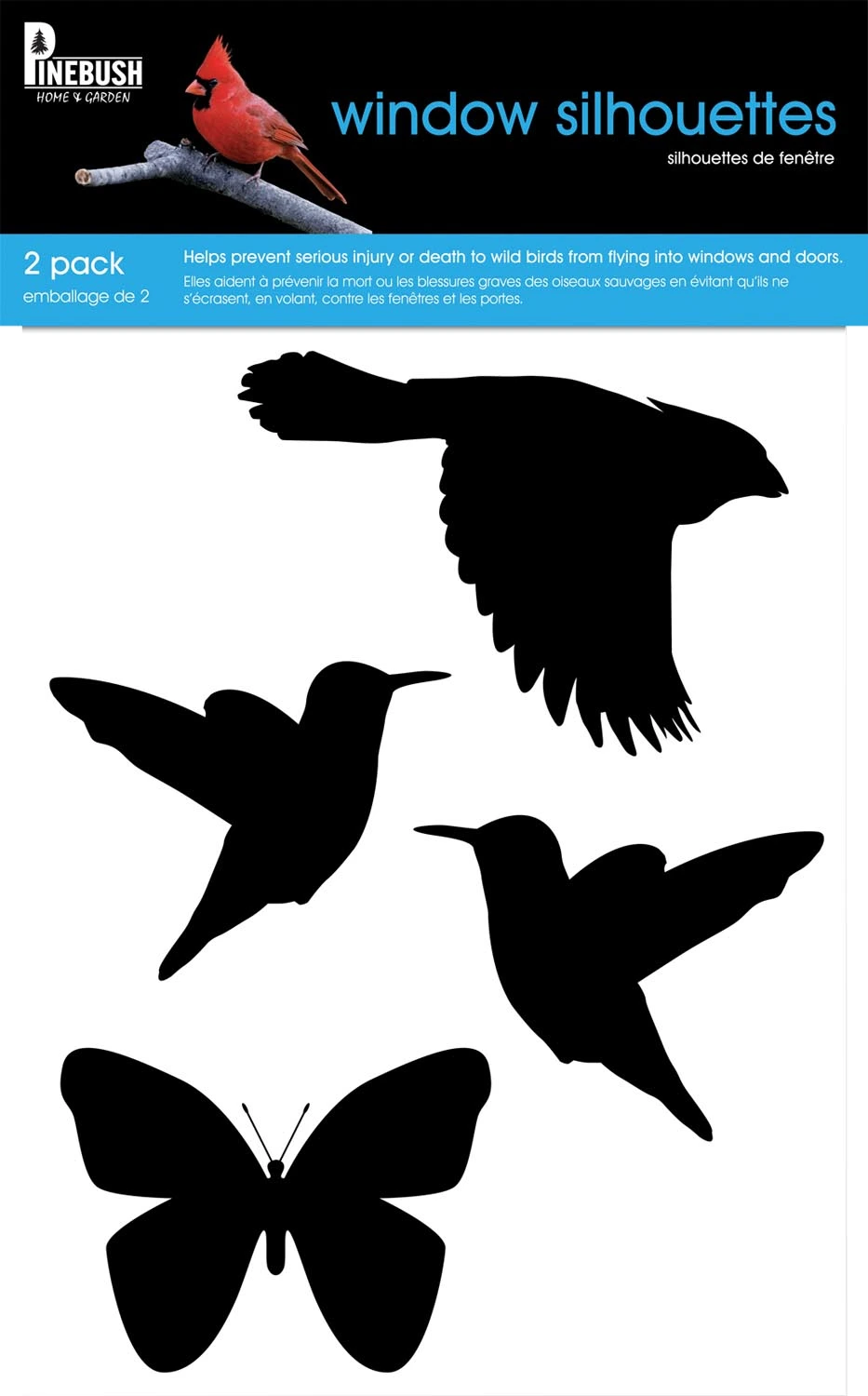 Helps prevent serious injury or death to wild birds from flying into windows and doors. 8 self adhesive removable window silhouettes. Easy to apply; simply peel and stick. Apply 1 silhouette for every 3 sq. ft. of window space.