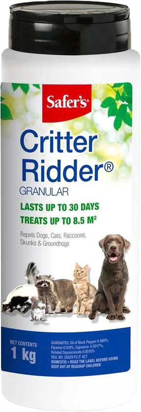 Chemfree Critter Ridder Animal Repellent Granules keeps skunks, raccoons, groundhogs, dogs, cats, and squirrels away by overwhelming their senses. This multi-species repellent, made from black pepper oil, piperine and capsaicin, uses the taste and smell to help prevent the intrusion of animals. Sprinkle the product indoors or outdoors to create a perimeter protection or spot treatment. An application can last up to 30 days.