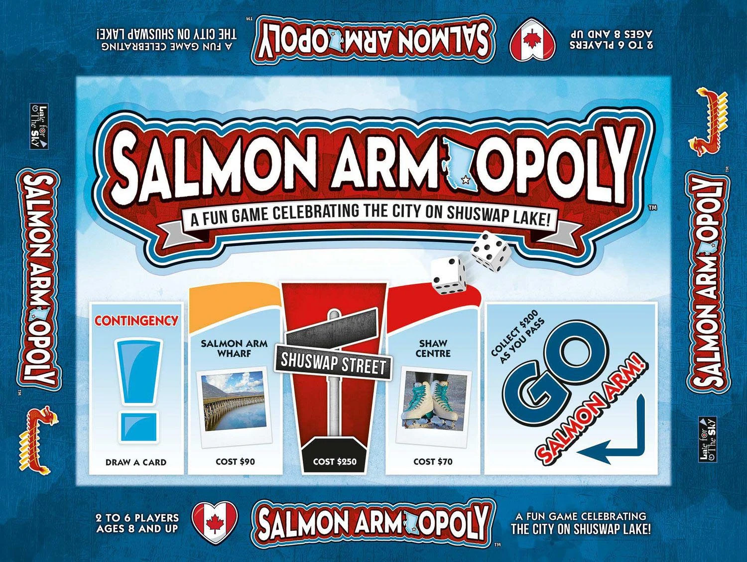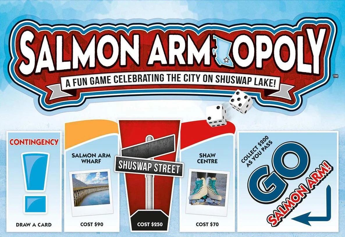 Buy your favourite Salmon Arm properties, increase your rent by collecting City Blocks and trading them in for Keys to the City. Sound easy? Well, add in some traffic jams, property tax and parking fines and it gets a little more difficult and a lot more fun! So choose your token and advance to GO Salmon Arm You may soon be the Mayor…or out of the game for eating too many Whiskey BBQ Ribs from Crown N’ Anchor!