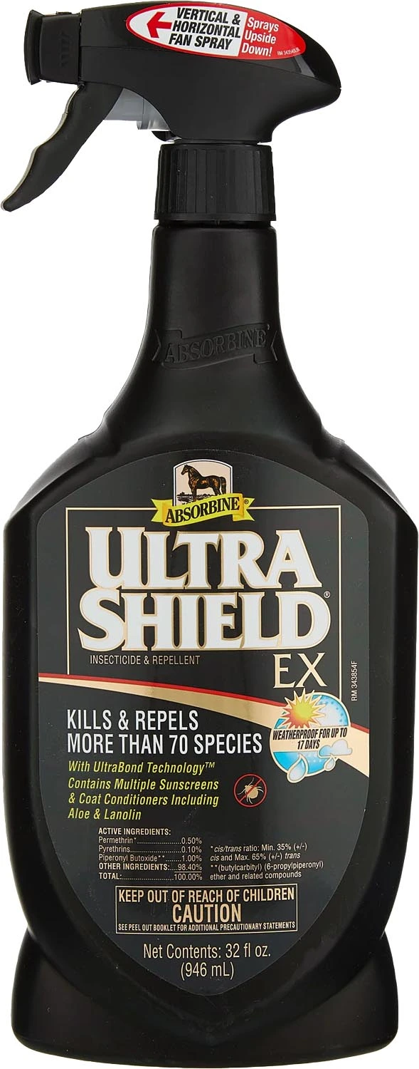 First there was UltraShield, and now there's UltraShield EX, the new standard in fly control protection from Absorbine. UltraShield EX is the first weatherproof, sweat - resistant formula that can provide 17 days of fly control.